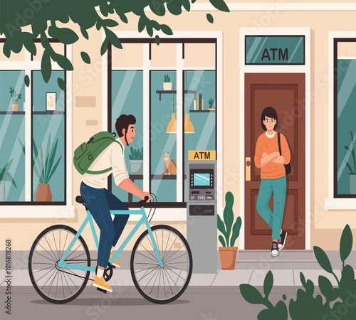 Young couple use eco transport concept illustration. Bicycle, roller, skateboard. Weekend healthy activity. Urban hipster lifestyle. Vector web site design template. Landing page website illustration