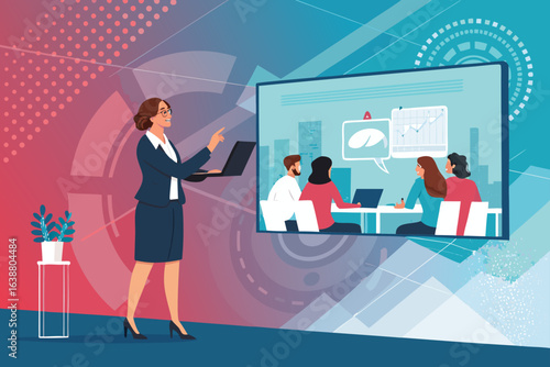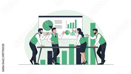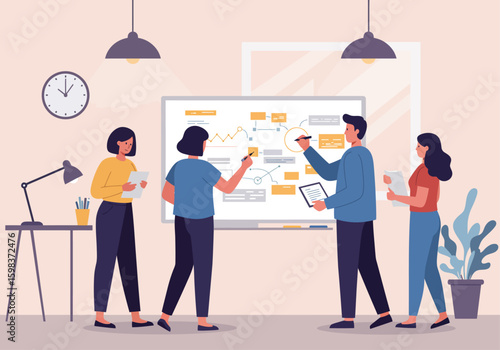 Young man choosing picture for purchase, flat vector illustration. Woman showing painting, piece of art to customer. Upgrading living room of apartment, house for comfort. Home improvement.