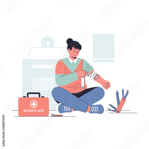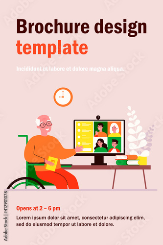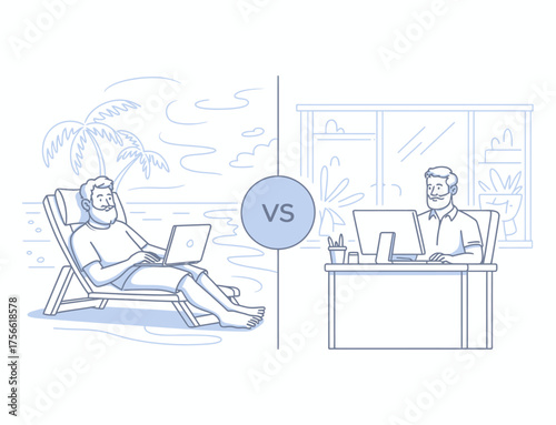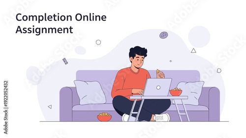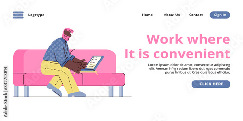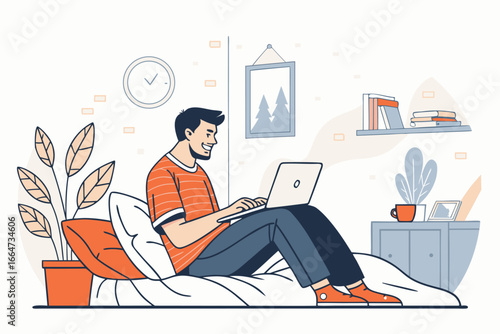 Young man, freelancer working on laptop computer from home in comfortable living room sitting on chair, flat vector illustration. Freelance, remote work, home office workspace.