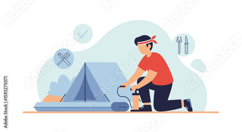 Young man in vr glasses rafting on virtual inflatable boat while sitting in armchair at home, flat vector isolated illustration. Virtual reality technologies.