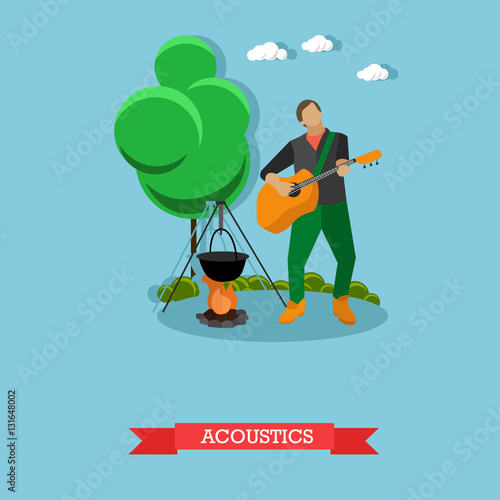Young man singing and playing acoustic guitar near campfire. Camping and acoustics concept template. Vector Illustration in flat design.