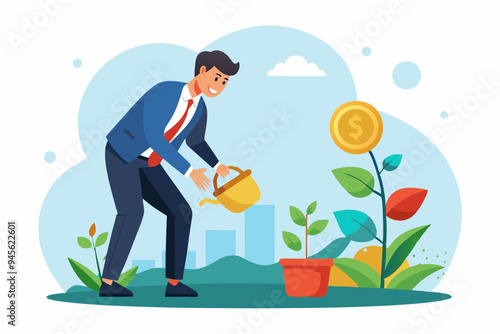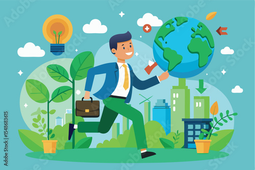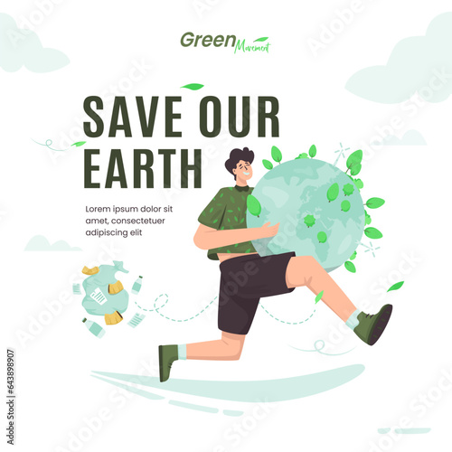 Young man, garbage collector, street cleaner collecting trash, throwing plastic bottle in garbage bag, flat vector illustration. Cleaning company services.