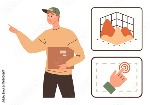 Young muscular bodybuilder holding weights dumbbells standing nearby protein bottle canister isolated on white background. Vector illustration of sportsman advertising sport nutrition supplement
