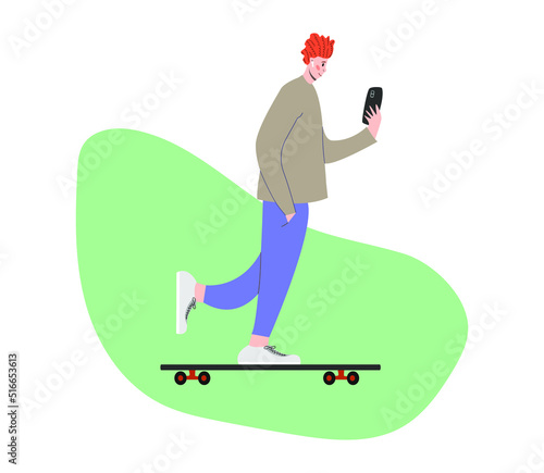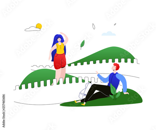People riding scooter flat vector illustration. Young man and woman couple using eco-friendly transport. Happy active guy and girl enjoy summer fun time leisure activity