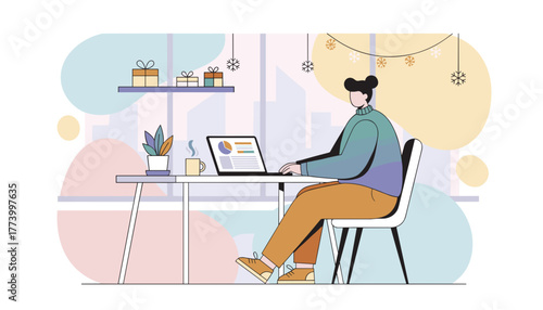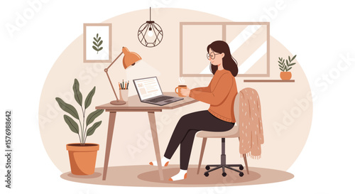 Young woman dressmaker character sewing on machine at workshop scene. Female seamstress fashion designer enjoying needlework hobby, home leisure vector illustration