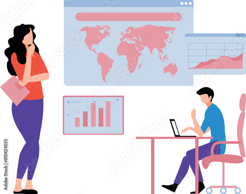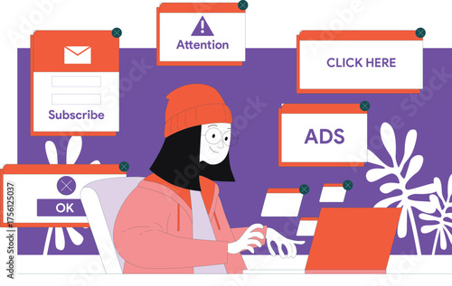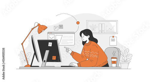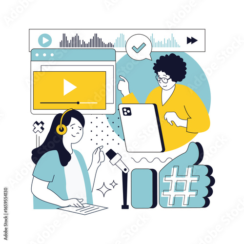 Young woman professional motion designer creating animated video making multimedia content for vlog or social media network on computer at workspace vector illustration