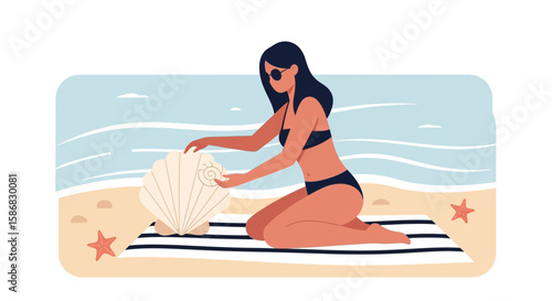 Young woman reading book on beach vector icon isolated on white background.