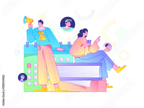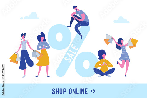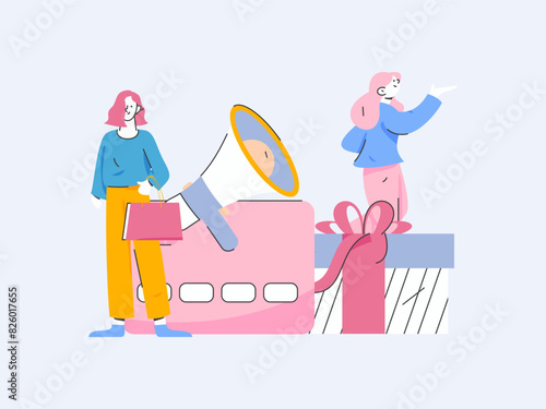 Young woman try eco friendly coat in fashion clothes store. Cruelty free dress concept illustration. Shopping, sale. Vector web site design template. Landing page website illustration.