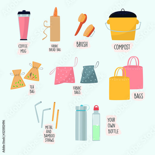 Zero waste tips and eco friendly reusable glass bottle, jar, cloth shopping bag, natural food, soap, vector flat illustration isolated on white background. Life without plastic, waste sorting concept.