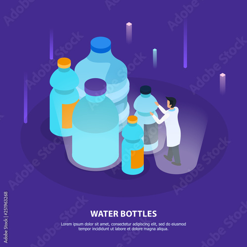 Huge metal water bottle, micro characters with reusable grocery bags and globe, vector illustration. Zero waste, no plastic, save planet concept for web banner, website page etc.
