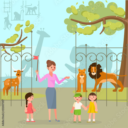 Zoo animals vector flat style design illustration. Happy kids with their teacher standing in front of zoo entrance gate.