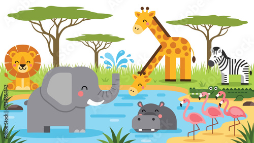 Zoo animals vector flat style design illustration. Exotic, woodland, polar animals and signboard with zoo lettering in center.