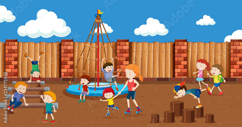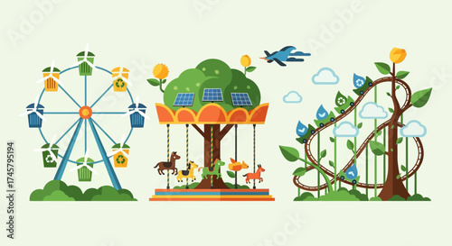 Zoo concept vector illustration. Visitors adults and kids seeing wild exotic animals in cages rhinoceros, giraffe and lion. Peafowls wandering among people. Zoo animals flat style design.