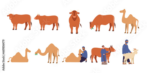 Zoo icon set. Vector flat illustration of zoo animals and visitors happy families, adults, kids watching polar penguins, exotic and woodland animals isolated on white background.